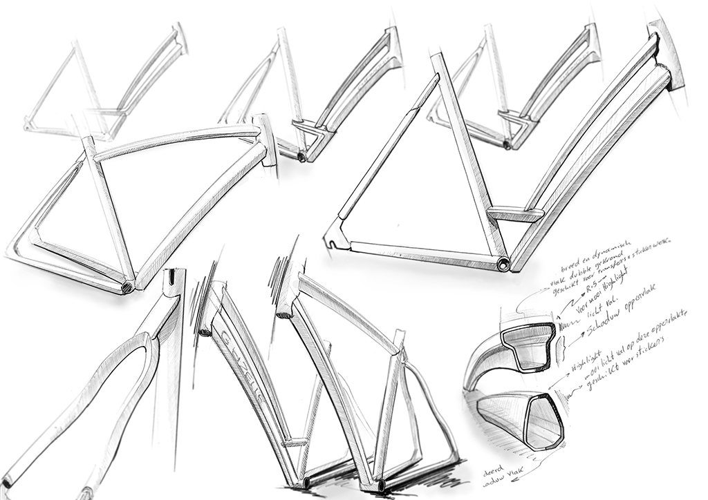 Designvisie: een sportieve fiets met pit, wendbaar en een unieke combinatie van hoogwaardige onderdelen.